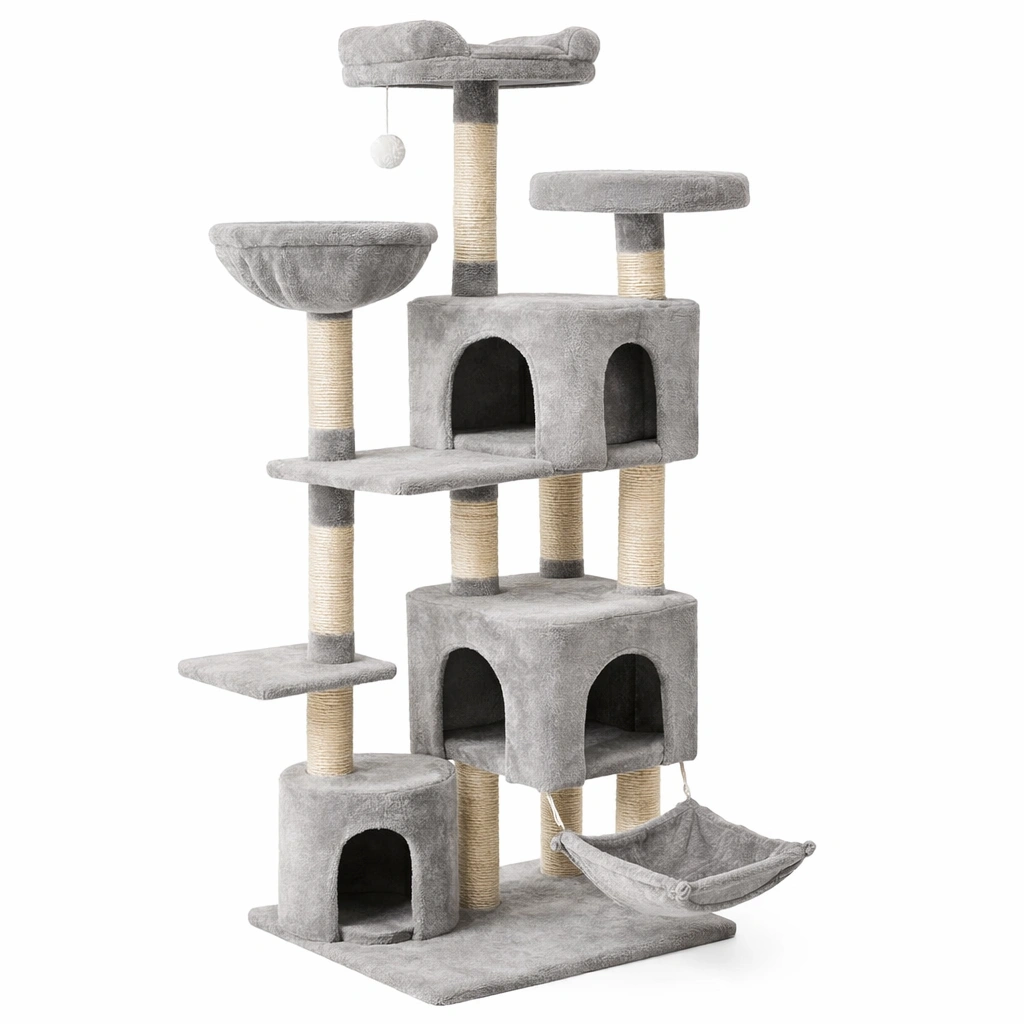 Árbol para gatos de múltiples niveles en felpa gris y sisal