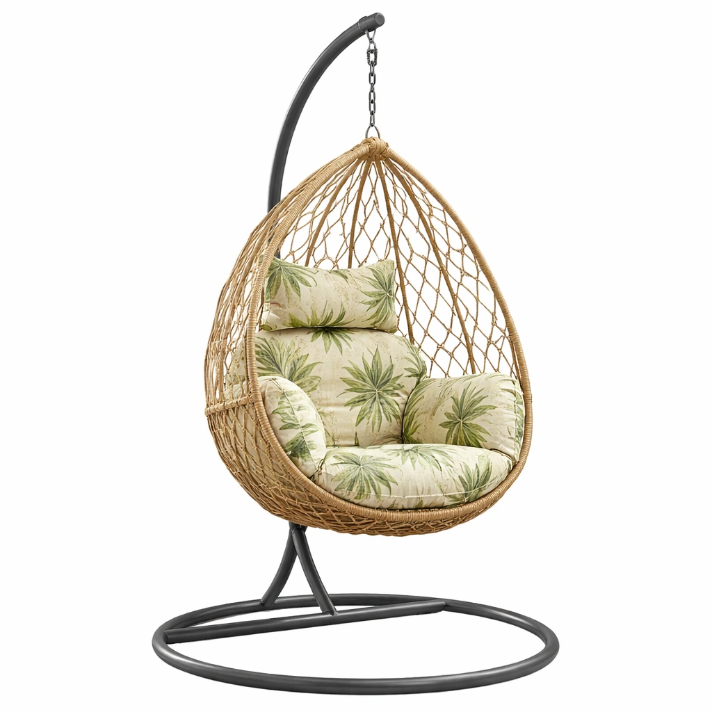 Altura total de la silla: 200 cm. Estructura principal de mimbre sintético con soporte de acero pintado. El material de relleno es espuma de poliuretano. Cojines incluidos con estampado de hojas verdes sobre tela beige. Capacidad de carga máxima de 120 kg. Resistente al agua. No resistente a los rayos UV.